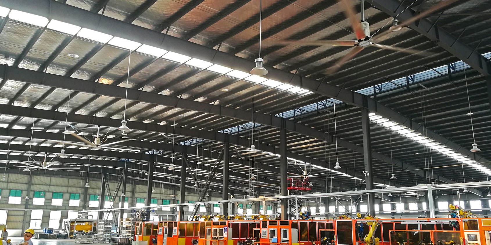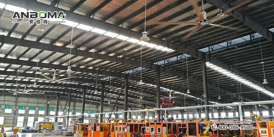 工业大吊扇在排积热和增加气流循环的同时,加速空气流动,加强室内外空气交换效率,把车间内的湿气排出室外,换新风进室内,让车间内的空气干爽清洁。